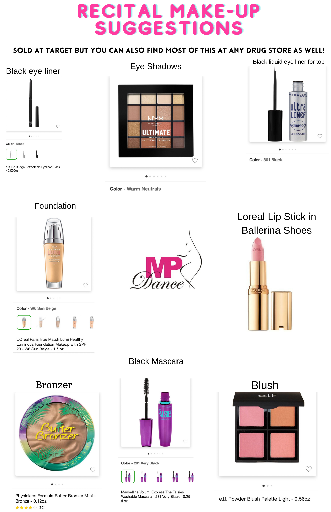 Dancers should arrive at dress rehearsal and recital in costume with hair and make-up complete. If they are in more than one performance number for recital, please check the performance order list to find out which costume is to be worn first. The following make-up colors will work for all costumes. Make-up: tans, browns, grays on eyes, black mascara & eyeliner, peach or rose color blush, pinks, rose, or mauves for lip gloss or lip stick.